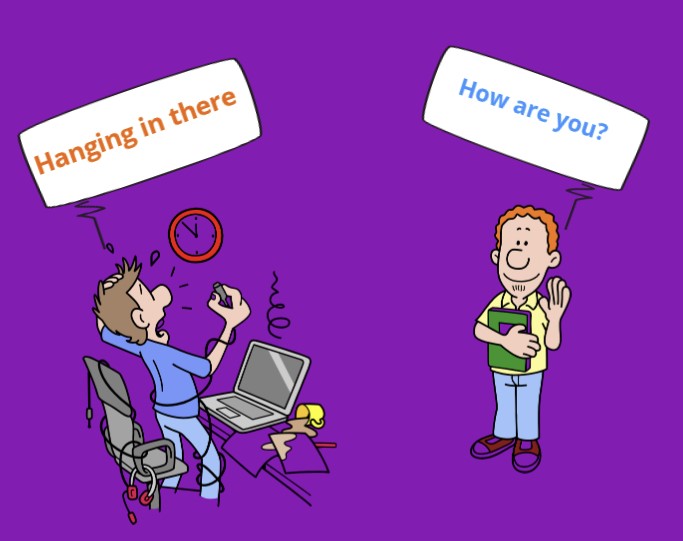 De uitdrukking “hanging in there” wordt vaak gebruikt om op een luchtige manier aan te geven dat je in een uitdagende situatie zit, maar dat je het redt. Het is een manier om te laten zien dat je doorzet, ook al is de situatie lastig. Voor studenten kan dit bijvoorbeeld betekenen dat je midden in een drukke examenperiode zit of veel huiswerk hebt, maar dat je het nog steeds aan het volhouden bent. Het is een positieve manier om te zeggen: “Het is moeilijk, maar ik geef niet op.”